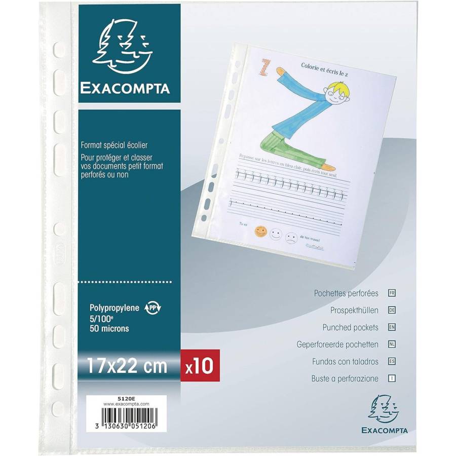 Sachet de 10 pochettes perforées incolores écolier - Insertion des documents par le haut de la pochette PERFORATION : 9 trous MATIÈRE : En polypropylène légèrement grainée épaisseur 5/100ème - Les pochettes du sachet sont transparentes, pour un usage quotidien FORMAT : Ecolier - Pochettes perforées format écolier pour les classeurs 17x22cm des plus petits. Dimensions : 19 x 22,5 cm CONDITIONNEMENT : en sachet de 10 pochettes perforées - coloris incolore
