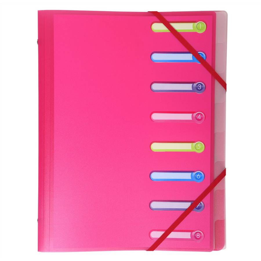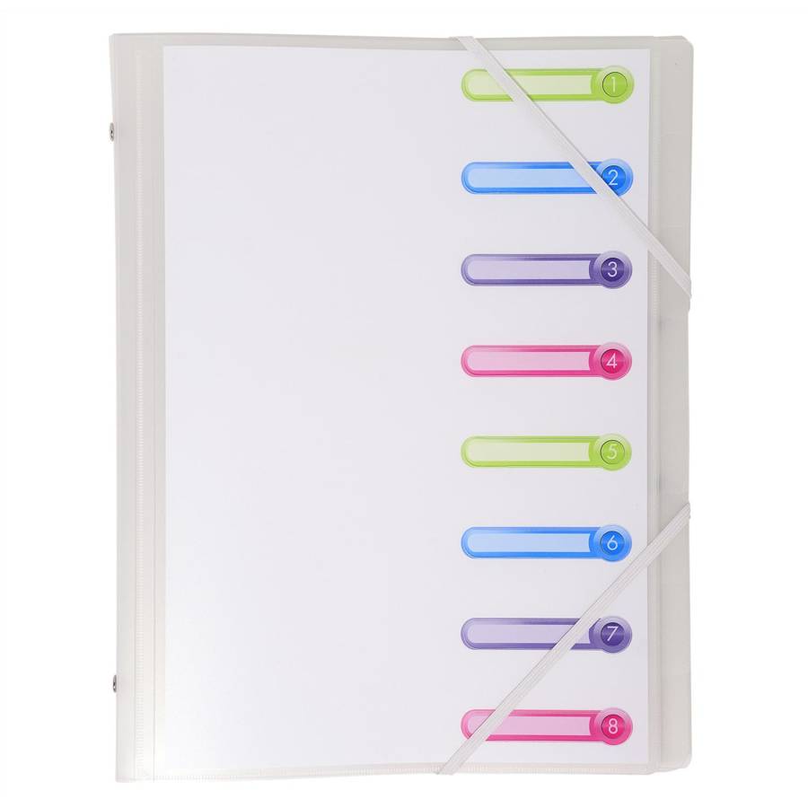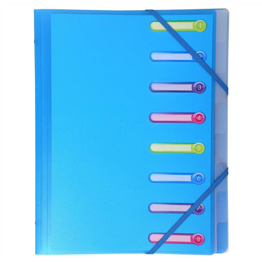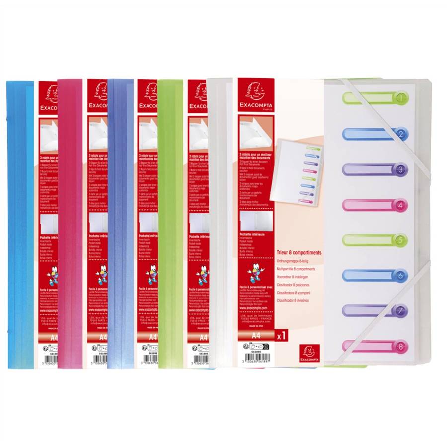 TRIEUR Chromaline avec 3 rabats permettant de stocker des feuilles volantes - capacité de classement complémentaire - En polypropylène translucide aux couleurs douces et tendance COUVERTURE : en polypropylène 5/10ème - intérieur en polypropylène translucide - pochette A4 en 2ème de couverture FERMETURE : par élastiques FENÊTRES découpées permettant d'identifier facilement les compartiments translucides NOMBRE DE COMPARTIMENTS : 8 - capacité jusqu'à 350 feuillets de 80 g COULEURS ALEATOIRES : bleu, incolore, rouge, turquoise, vert