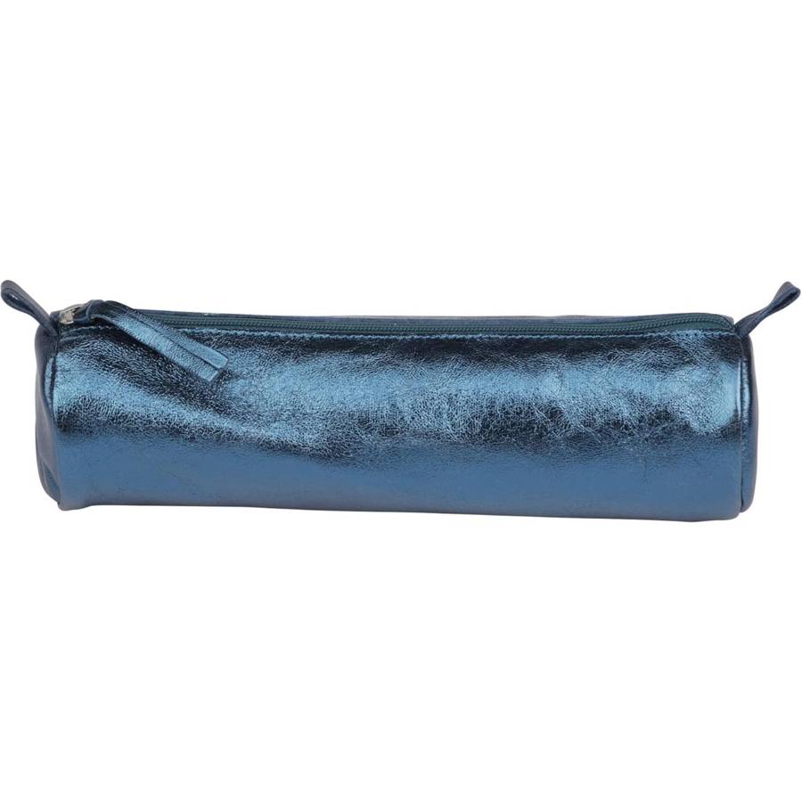 Trousse Scolaire Cuirisé Ronde Ø5,5x22 cm Véritable Cuir irisé Indigo