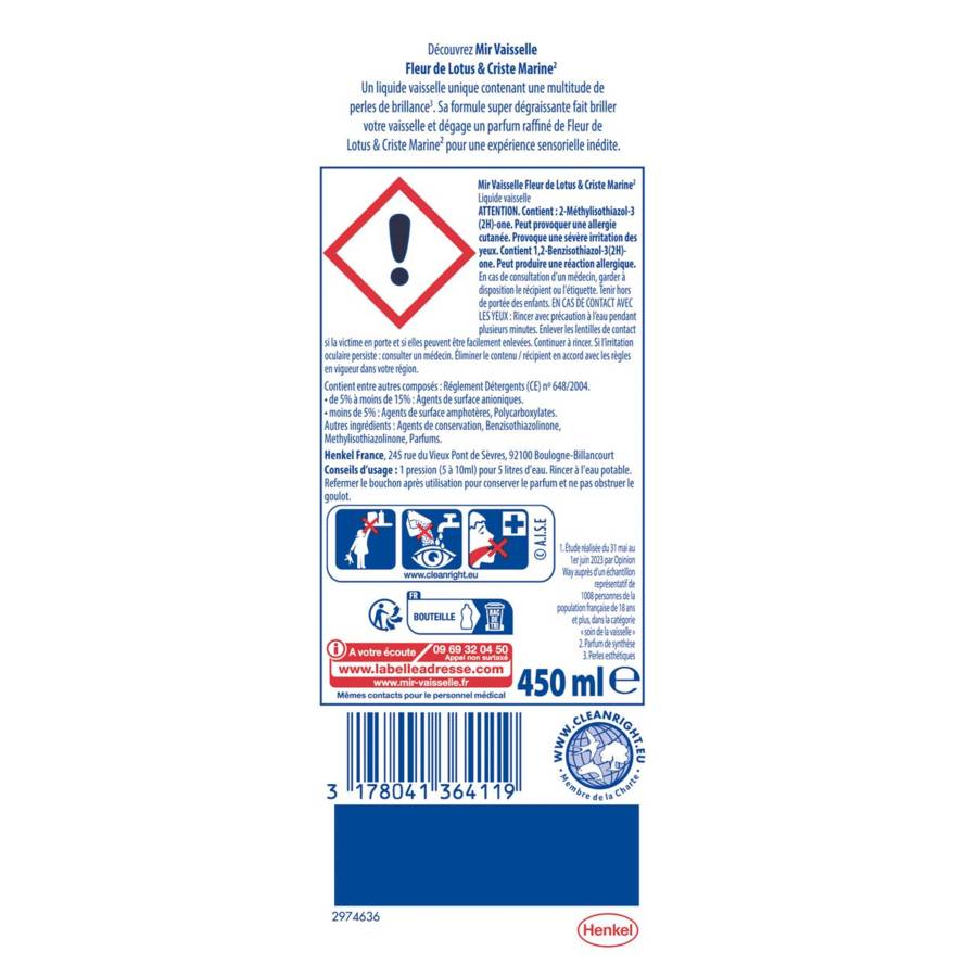 Mir Vaisselle Perles de brillance Fleur de Lotus & Criste Marine** est un liquide vaisselle facilement reconnaissable à sa couleur bleue. Il met en action l'efficacité de Mir, associée à l'esthétique des perles*** et au doux parfum de Fleur de Lotus & Criste Marine**. Sa formule est spécifiquement développée pour laver votre vaisselle avec un résultat impeccable grâce à ses puissants ingrédients dégraissants et ses traditionnelles vertus nettoyantes. Mir contribue au respect de l'environnement avec son engagement fort: emballages comportant au moins 86% de matières recyclées.