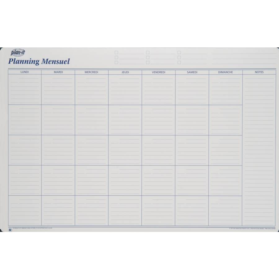 Planning mural simple ou double face souple. Plastification à 125μ. 7 jours de la semaine + une colonne "notes". 5 lignes pour les semaines. Recto/Verso 1 face de présentation verticale et 1 face de présentation horizontale.