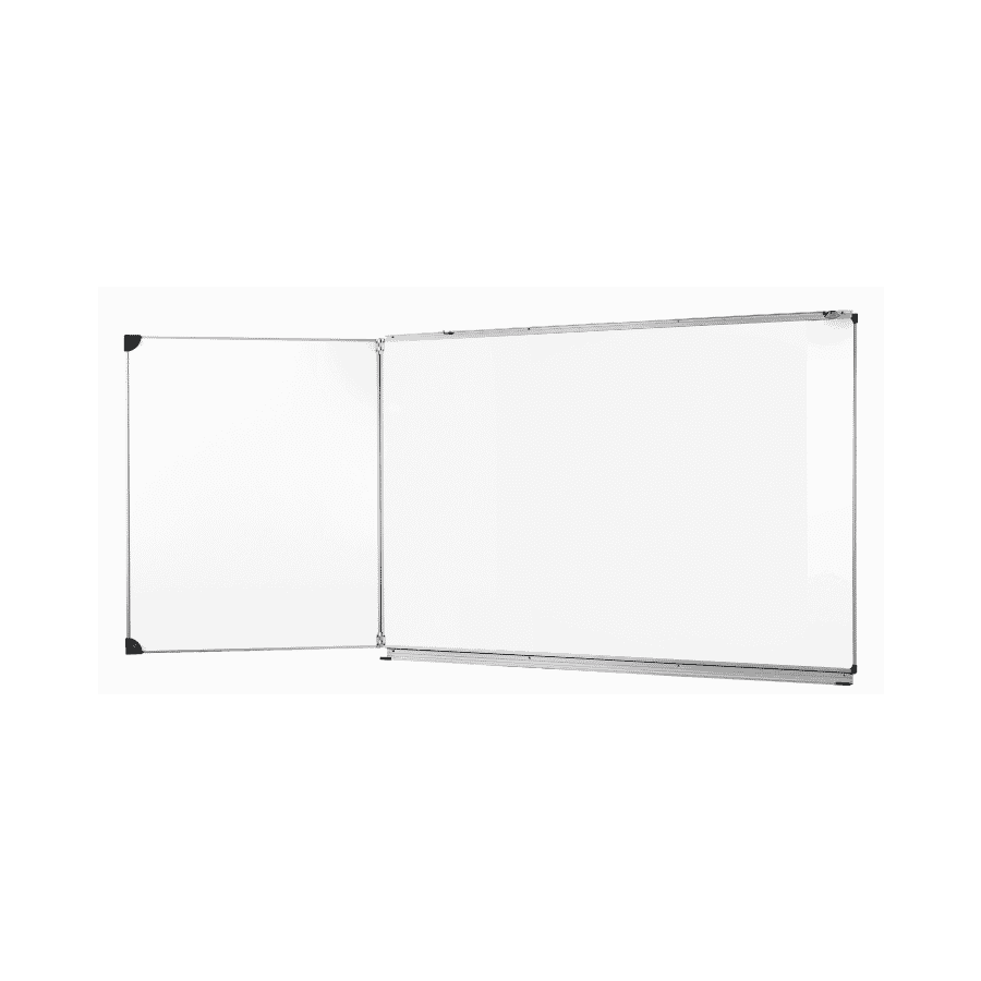 1 paneau central de 200 cm ou 300 cm + 1 volet de 100 cm qui recouvre une partie de ce panneau. Surface émaillée blanche. Le volet se positionne à droite ou à gauche, au choix lors du montage. Possibilité de sérigraphies.