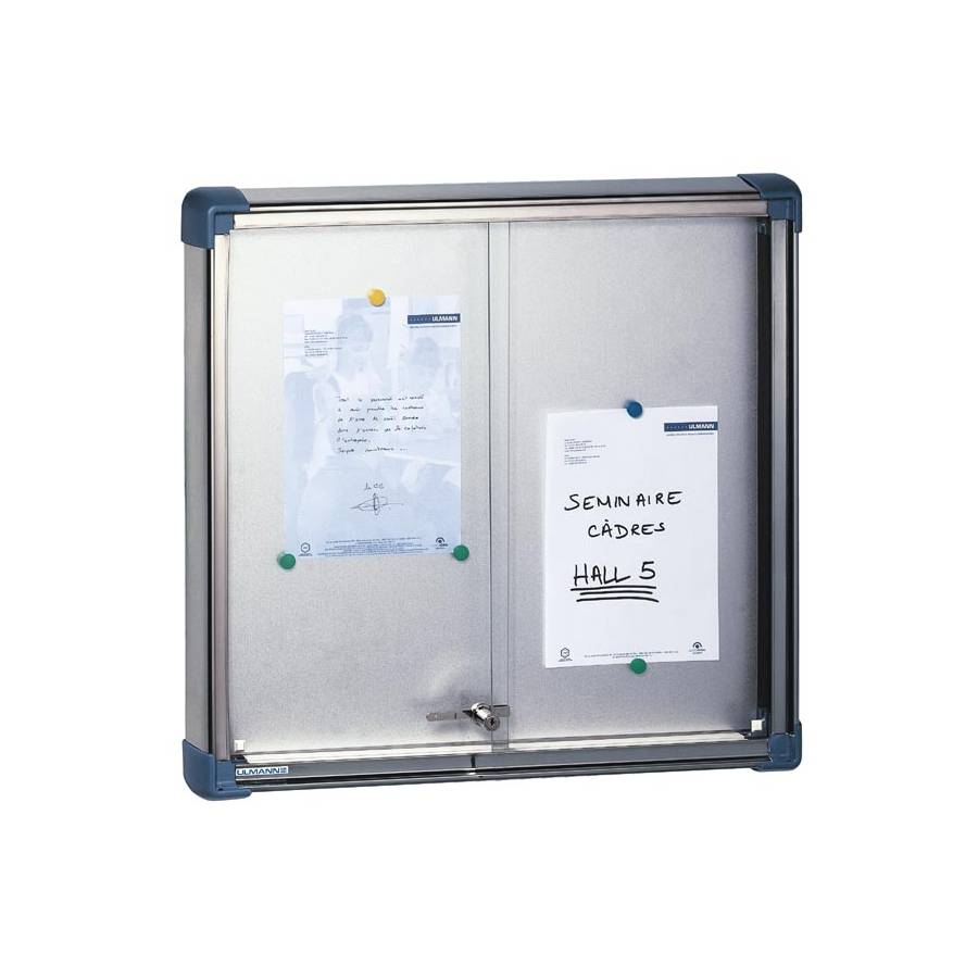 Fond en tôle alu zinc, vitrage en verre Securit, vitrage coulissant, encadrement en acier inox, système de verrouillage par serrure à crémaillère, affichage par aimants (non fournis).