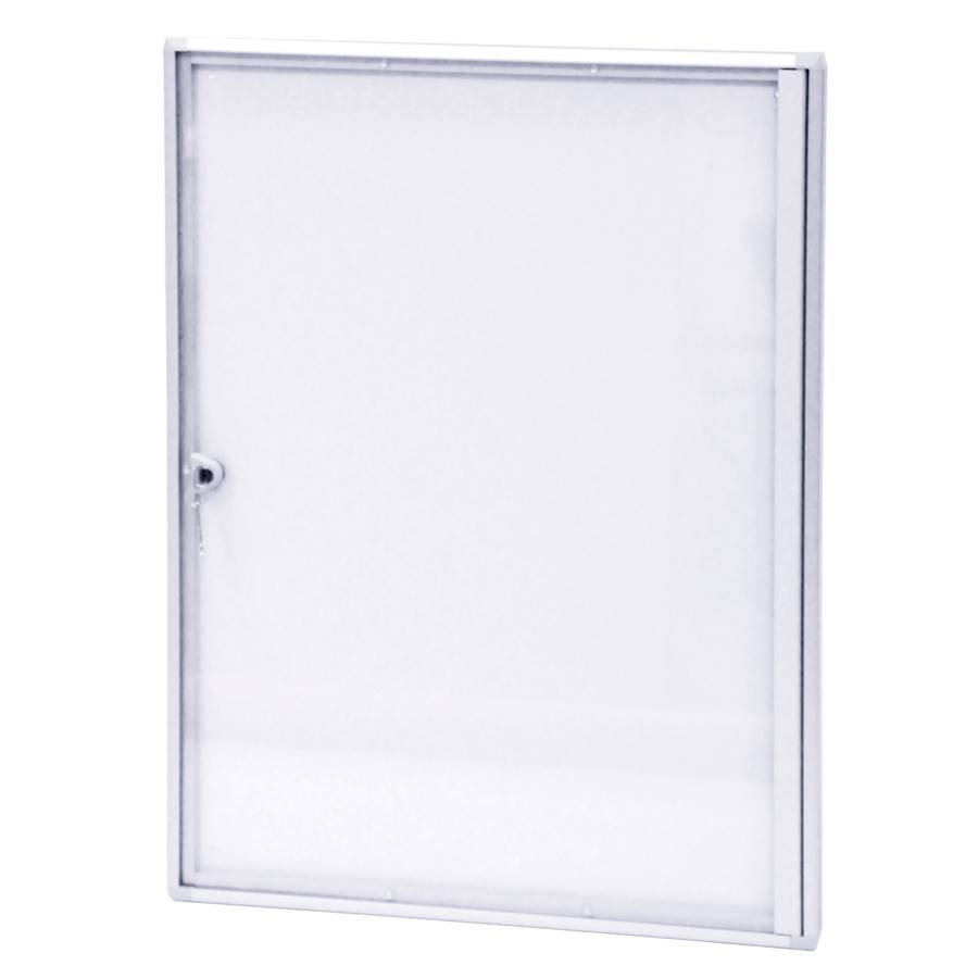 Fond en tôle laquée blanche (nettoyage : brosse ou microfibre), vitrine en plexiglas, porte ouvrante, encadrement aluminium anodisé, coloris naturel, système de verrouillage par serrures sécurisées et clés, affichage magnétique par aimants et écriture au marqueur effaçable à sec (non inclus).