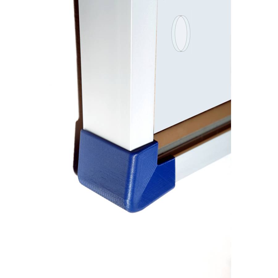 Fond en liège, vitrage en verre Securit, vitrage coulissant, angles arrondis, encadrement en aluminium anodisé, système de verrouillage sécurisé.