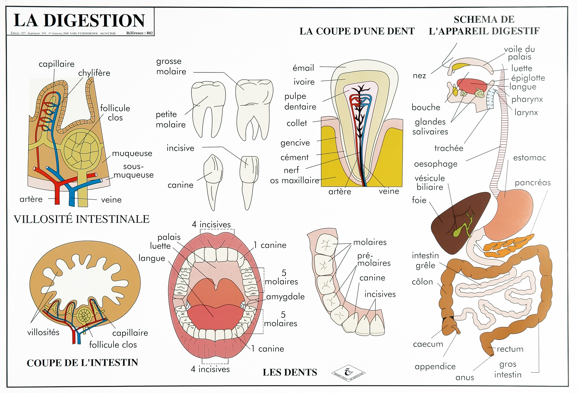Planche éducative plastifiée en 42μ et munie d'œillets pour l'accrochage au tableau. Surfaces recto / verso : circulation du sang / digestion.