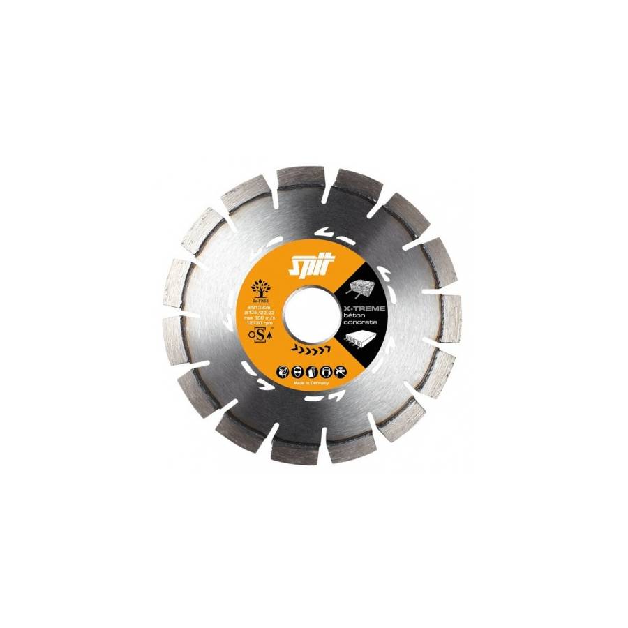 Disque diamant Xtreme béton Spit. Ce disque permet la découpe de béton, parpaing, brique pleine, tuile, carreau céramique et marbre.
